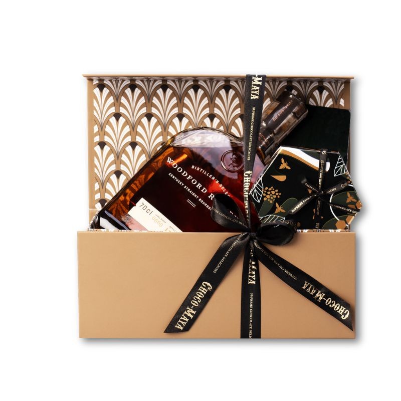 Ręcznie kaszerowany kuferek kryjący amerykański Bourbon Woodword Reserve oraz asortyment produktów kolonialnych Choco Maya.