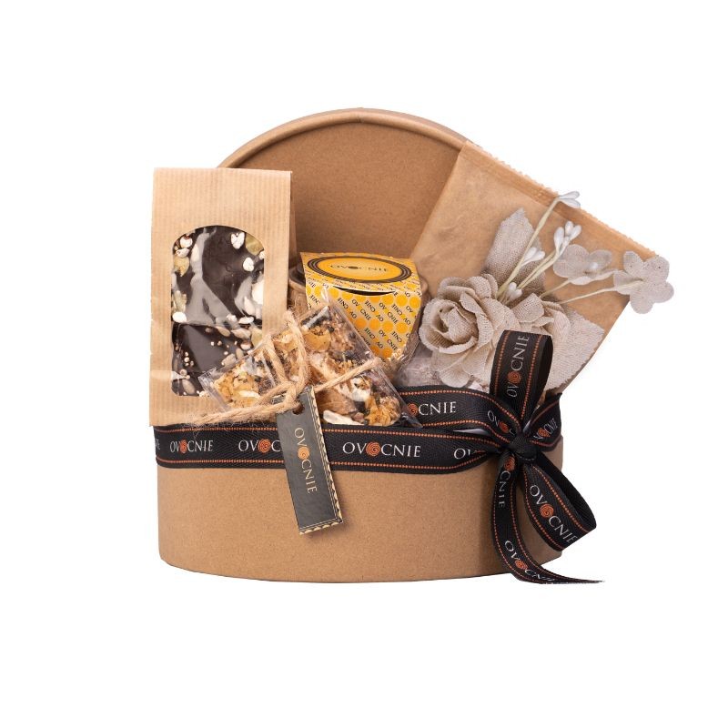 Papierowa tuba kryjąca asortyment naturalnych produktów Ovocnie: mieloną kawę 100% Arabica o smaku cynamonowym 50 g, tafelki z czekolady deserowej o zawartości 72% kakao z bakaliami i szczyptą soli himalajskiej 60 g, agrest w czekoladzie deserowej i kakao 40 g, ciasteczko granola z kandyzowaną skórką pomarańczową 45 g, daktylowe kule z kokosem 30 g. Całość w zamkniętym pudełku z wypełnieniem i dekoracją.