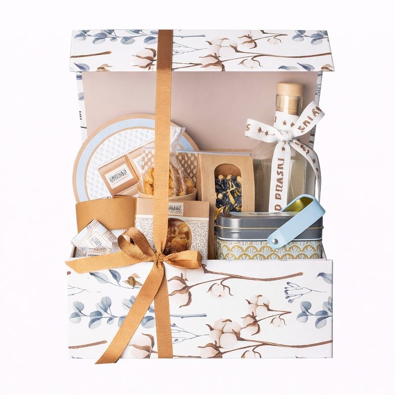 Ręcznie kaszerowany kuferek kryjący butelkę wypełnioną malinami, żurawiną, płatkami kwiatów i cukrem trzcinowym (zestaw do samodzielnego wykonania świątecznej nalewki) oraz asortymentem tradycyjnych specjałów marki Skład Praski: kawę mieloną 100% Arabica, zestaw mini tabliczek z deserowej czekolady z certyfikatem Cocoa Horizons o zawartości 72% kakao, czarną herbatę z owocami, migdały w mlecznej czekoladzie oprószone cynamonem, puszkę karmelizowanych ciasteczek z cynamonem, BIO paluszki z miodem i migdałami, orzechy w karmelu, tabliczkę mlecznej, certyfikowanej czekolady o zawartości 33% kakao z owocami, drewnianą pieczątkę do ciasteczek, mini tabliczki z mlecznej czekolady.
