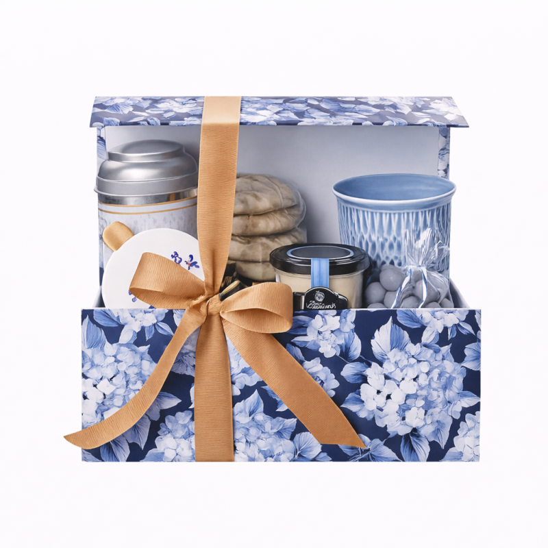 Ręcznie kaszerowane pudełko kryjące: porcelanowy kubek o pojemności z fabryki w Ćmielowie, puszkę rozgrzewającej herbaty z przyprawami korzennymi, słoiczek miodu z pyłkiem pszczelim, Toruńskie Pierniki w czekoladzie z nadzieniem z czarnej porzeczki, mini tabliczki z certyfikowanej, białej czekolady o zawartości 36% masła kakaowego, czarną porzeczkę w certyfikowanej, białej czekoladzie z lawendą.