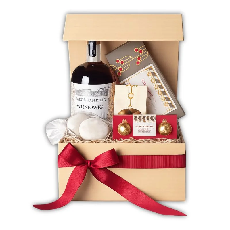 Ręcznie kaszerowany kuferek kryjący: Wiśniówkę 30% Jakob Haberfeld sporządzoną z naturalnych wiśni pochodzących od podkarpackich sadowników z dodatkiem aromatycznych przypraw korzennych, która doskonale komponuje się z gorącą czekoladą i herbatą oraz praliny z nadzieniem z dodatkiem Wiśniówki Haberfeld, lukrowane pierniczki, tabliczkę deserowej czekolady z nadzieniem z dodatkiem Wiśniówki Haberfeld, laskowe orzeszki w białej czekoladzie oprószone zieloną herbatą matcha.