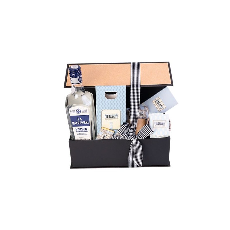 Ręcznie kaszerowany kuferek kryjący wódkę Monopolową J.A. Baczewski przygotowaną na podstawie oryginalnej, przedwojennej receptury z trzykrotnie destylowanego spirytusu ziemniaczanego oraz asortyment produktów Skład Praski: asortyment mini tabliczek z mlecznej czekolady z certyfikatem Cocoa Horizons, karmelizowane orzechy ziemne, kostki sezamowe, ciasteczka owsiane z czekoladą.