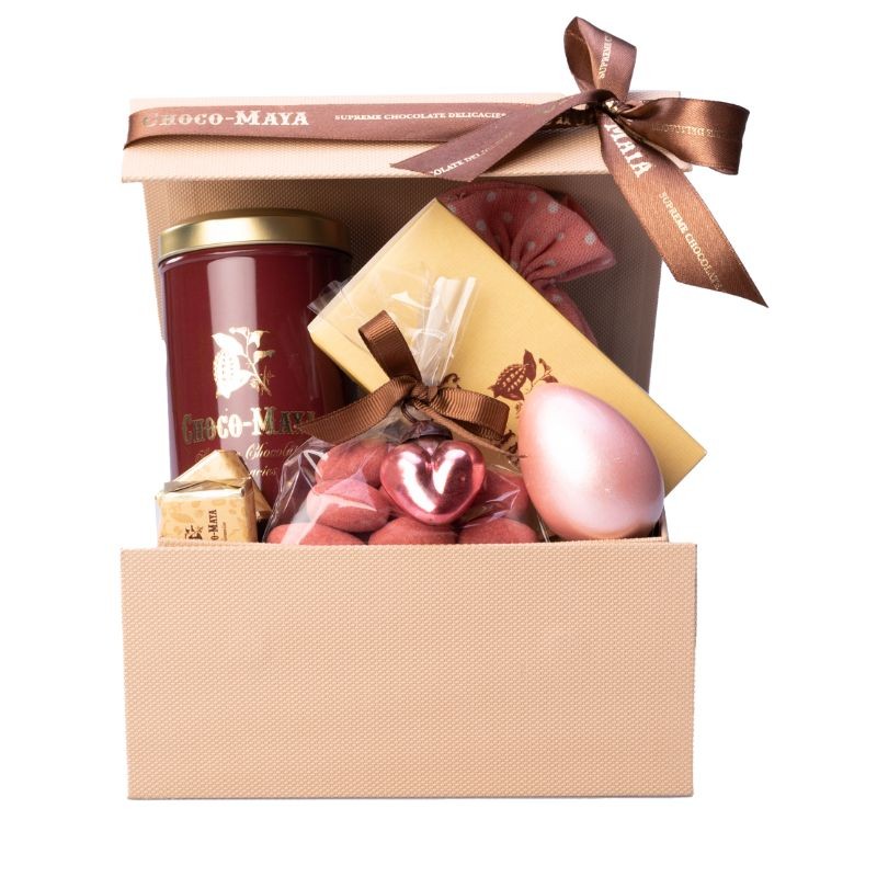 Asortyment czekoladowych produktów kolonialnych Choco Maya w ręcznie kaszerowanym pudełku z wielkanocną dekoracją.