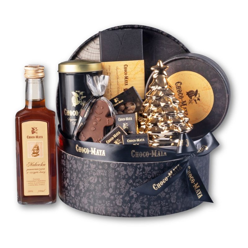 Papierowa tuba kryjąca asortyment kolonialnych produktów Choco Maya: nalewkę na naturalnych pomarańczach i ziarnach kawy Arabica, puszkę czarnej herbaty z owocami, ręcznie robione karmelki mocca ze śmietanką i kawą, ciasteczka z przyprawami korzennymi w tubie, rodzynki w białej czekoladzie oprószone kawą, czekoladowe figurki Pan Ciasteczko, mini tabliczki z certyfikowanej, białej czekolady, choinkę ceramiczną.