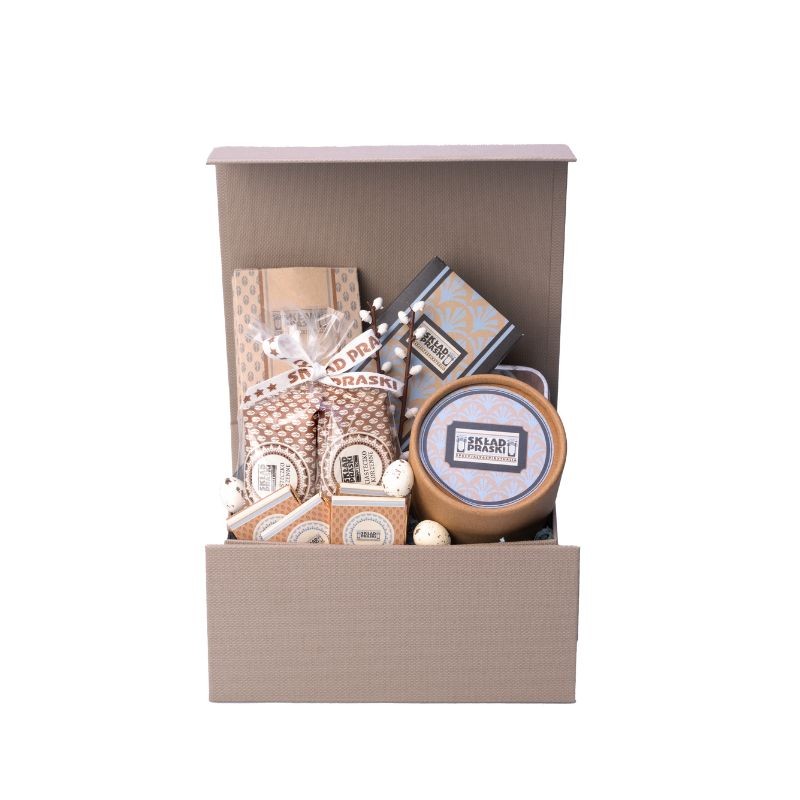 Kuferek kryjący asortyment produktów Skład Praski: paluszki sezamowe, puszkę ręcznie robionych karmelków, czarną herbatę z przyprawami, karmelizowane ciasteczka korzenne z cynamonem, mini tabliczki z czekolady z certyfikatem Cocoa Horizons o zawartości 72% kakao, karmelizowane orzeszki ziemne w tubie.