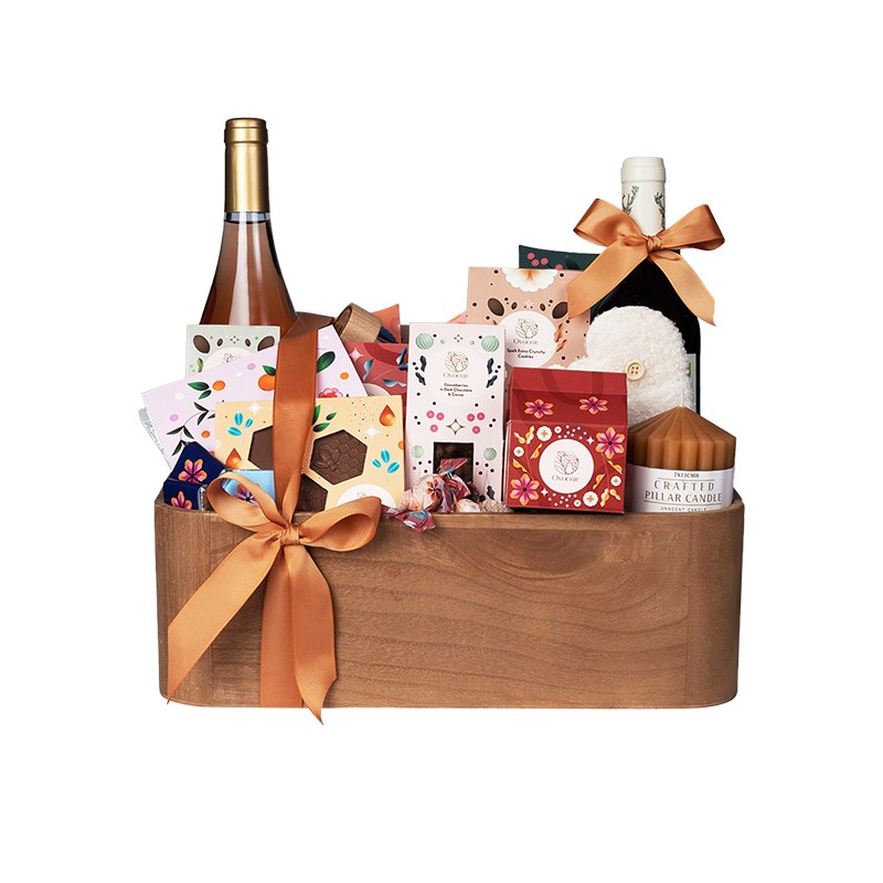Drewniana skrzynia (*opakowanie do ponownego wykorzystania) kryjąca różowe wino Rare Rosado Lisboa VR, Touriga National, Syrah i ekologiczne, czerwone wino YOGA Syrah Organic oraz asortyment naturalnych produktów Ovocnie: zieloną herbatę Sencha z płatkami kwiatów i skórką cytrynową, ciasteczka migdałowe słodzone syropem z agawy, batonik o zawartości 48% owoców, migdały w białej czekoladzie z certyfikatem Cocoa Horizons, oprószone zieloną herbatą matcha, ręcznie robione karmelki na bazie zielonej herbaty matcha i naturalnej śmietanki, agrest w certyfikowanej czekoladzie deserowej oprószony kakao, ręcznie robione karmelki z dodatkiem skórki pomarańczowej i Earl Grey, śliwki w certyfikowanej czekoladzie, mini tabliczki z certyfikowanej czekolady deserowej Cocoa Horizons o zawartości 72% kakao, paluszki BIO z miodem i migdałami, marmoladki o zawartości 70% owoców, pełnoziarniste kule z morelą, drewnianą pieczątkę do ciasteczek i świecę.