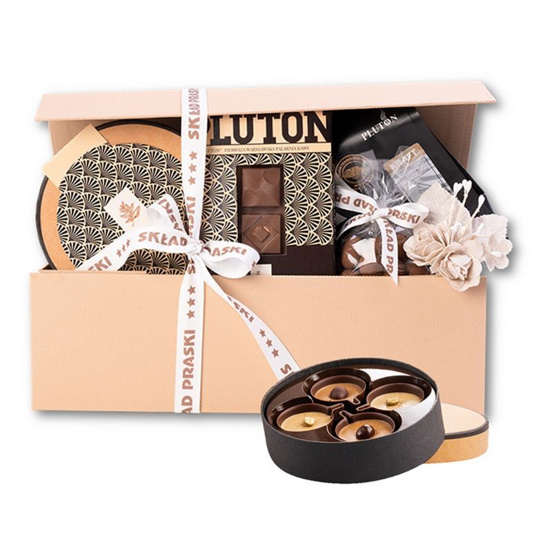 Ręcznie kaszerowane pudełko kryjące: kawę Pluton Perłową Kraft w ziarnach, Cymesiki Skład Praski czyli asortyment kubeczków z czekolady deserowej wypełnionych kremem z dodatkiem kawy Pluton, agrest w certyfikowanej Cocoa Horizons czekoladzie deserowej oprószony kakao, tabliczkę mlecznej czekolady z nadzieniem kawowym Pluton.