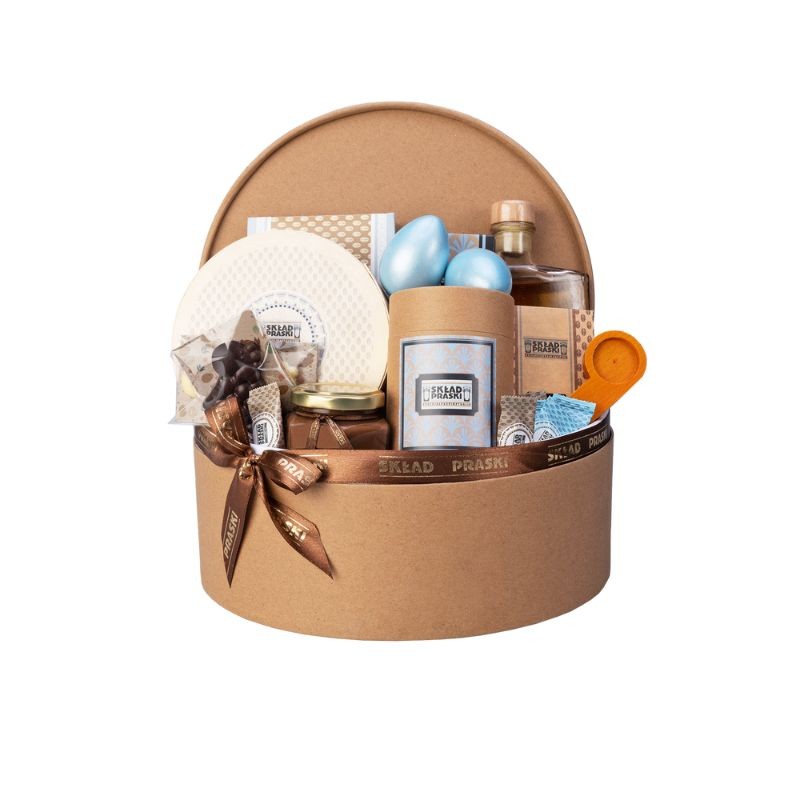 Papierowa tuba kryjąca asortyment produktów Skład Praski: Nalewkę Miodową sporządzoną na bazie naturalnej kompozycji polskich miodów: gryczanego i wielokwiatowego oraz wanilii, paluszki sezamowe, tabliczkę mlecznej czekolady z certyfikatem Cocoa Horizons z nadzieniem, skrzyneczkę ciasteczek z przyprawami korzennymi, mus malinowy i czekoladą, czarną herbatę z rozgrzewającymi przyprawami i owocami w zestawie z drewnianą miarą/klipsem, orzeszki prażone w karmelu, ręcznie robione, naturalne karmelki piernikowe i żurawinowe, baranki z certyfikowanej czekolady.
