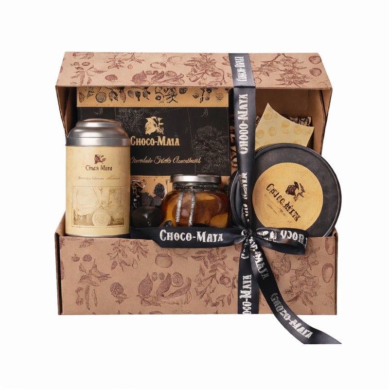 Kartonowe pudełko kryjące asortyment produktów kolonialnych Choco Maya: zestaw czekoladowych filiżanek do przyrządzenia na gorąco, puszkę czarnej herbaty z rozgrzewającymi przyprawami, cytrynki w zalewie miodowej, nerkowce w czekoladzie, ciasteczka z czekoladą, marmoladki pektynowe w tubie, czekoladowe trufle.