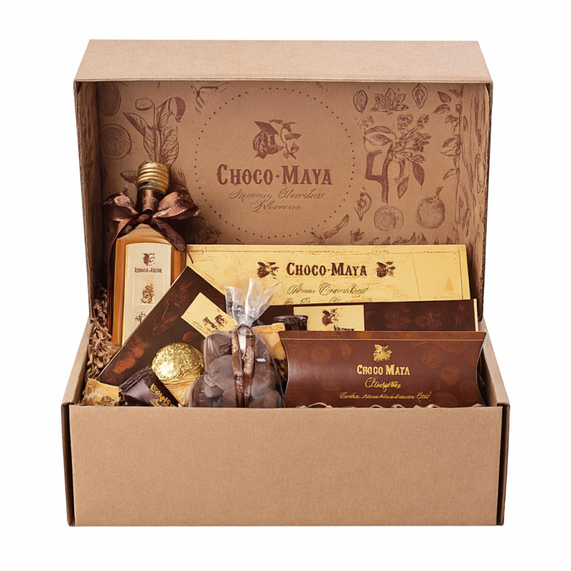 Kartonowe pudełko kryjące asortyment produktów kolonialnych Choco Maya: likier o smaku słonego karmelu na bazie mleka i karmelizowanego cukru ze szczyptą soli, karmelizowane ciasteczka z cynamonem, puszkę rodzynek w białej czekoladzie z certyfikatem Cocoa Horizons oprószonych kawą, kulę z certyfikowanej, mlecznej czekolady wypełnioną owocami do rozpuszczenia w kubku gorącego mleka, skórkę pomarańczową w deserowej czekoladzie z nutą Earl Grey, ręcznie robione karmelki mocca z dodatkiem kawy i śmietanki, kwaskowy agrest w czekoladzie deserowej i kakao.