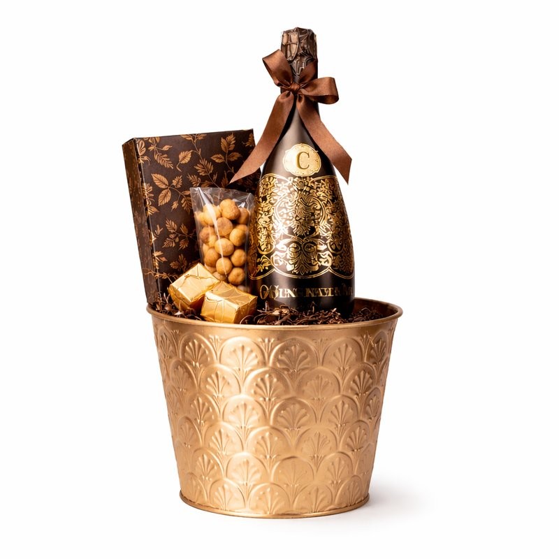 Metalowe wiaderko (*opakowanie do ponownego wykorzystania) kryjące asortyment kolonialnych produktów Choco Maya: hiszpańskie wino musujące - edycja limitowana - Codorniu Cava Brut Edition Limited DO Cava Metode Tradicional Macabeu, Xarel-lo, Parellada, Chardonnay, asortyment pralin i trufli czekoladowych, rodzynki w białej czekoladzie, pralinki kostki.