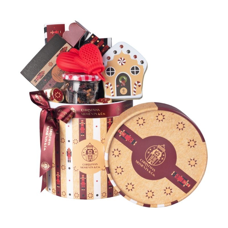 Papierowa tuba kryjąca asortyment świątecznych smakołyków Christmas Moments: tabliczkę mlecznej czekolady o zawartości 33% kakao z żurawiną, asortyment bakalii w mlecznej i białej czekoladzie, migdały w mlecznej czekoladzie oprószone cynamonem, orzechy w słonym karmelu, puszkę ręcznie robionych karmelków malinowych z cytryną, czekoladowe pralinki, zimową herbatę w słoiczku, świąteczny zaparzacz do herbaty