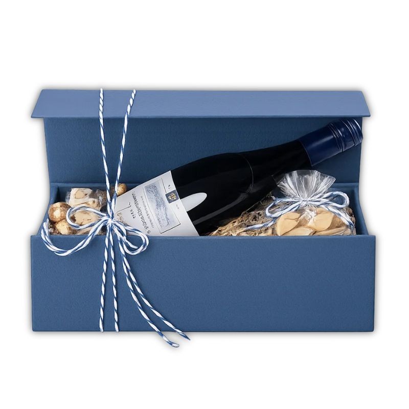 Ręcznie kaszerowany kuferek kryjący francuskie, czerwone wino wytrawne Les Petits Secrects Ropiteau Pinot Noir oraz asortyment przekąsek: naturalne chipsy bananowe, świąteczne ciasteczka w woreczku, bombki z mlecznej czekolady, belgijskie nugaty z miodem i migdałami.