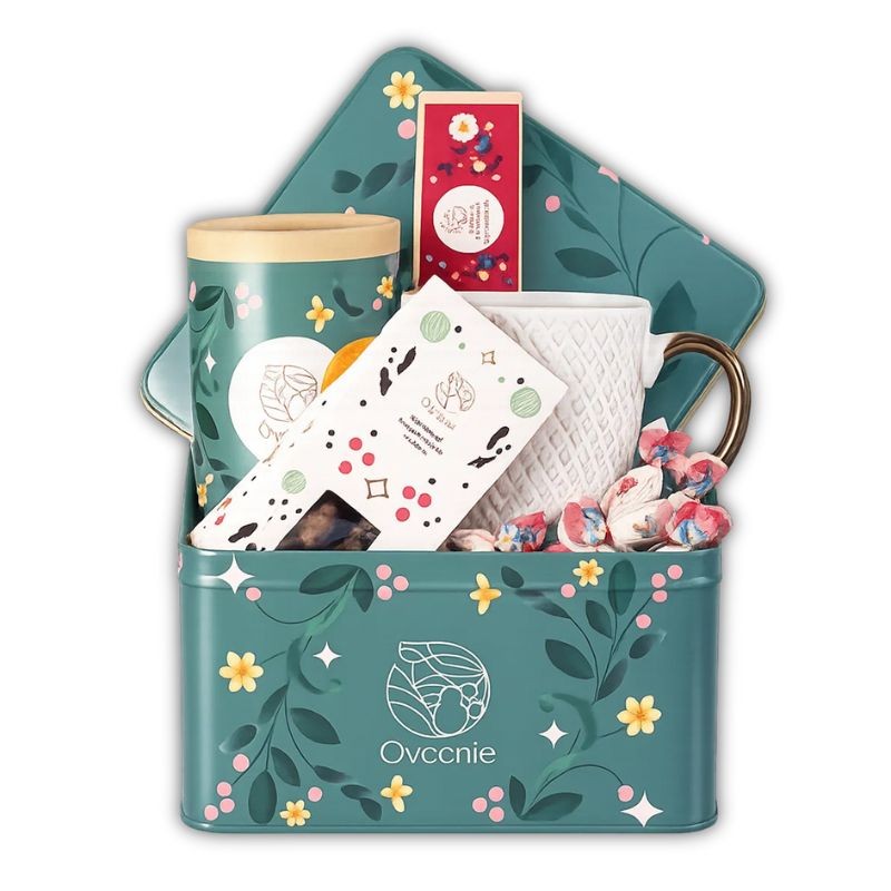 Metalowa puszka kryjąca asortyment naturalnych produktów Ovocnie: tabliczkę deserowej czekolady o zawartości 72% kakao z certyfikatem Cocoa Horizons i dodatkiem wiśni i pestek dyni, agrest w deserowej czekoladzie oprószony kakao, tubę herbaty Earl Grey, ciasteczka owsiane, ręcznie robione karmelki z dodatkiem śmietanki i zielonej herbaty matcha, kubek.