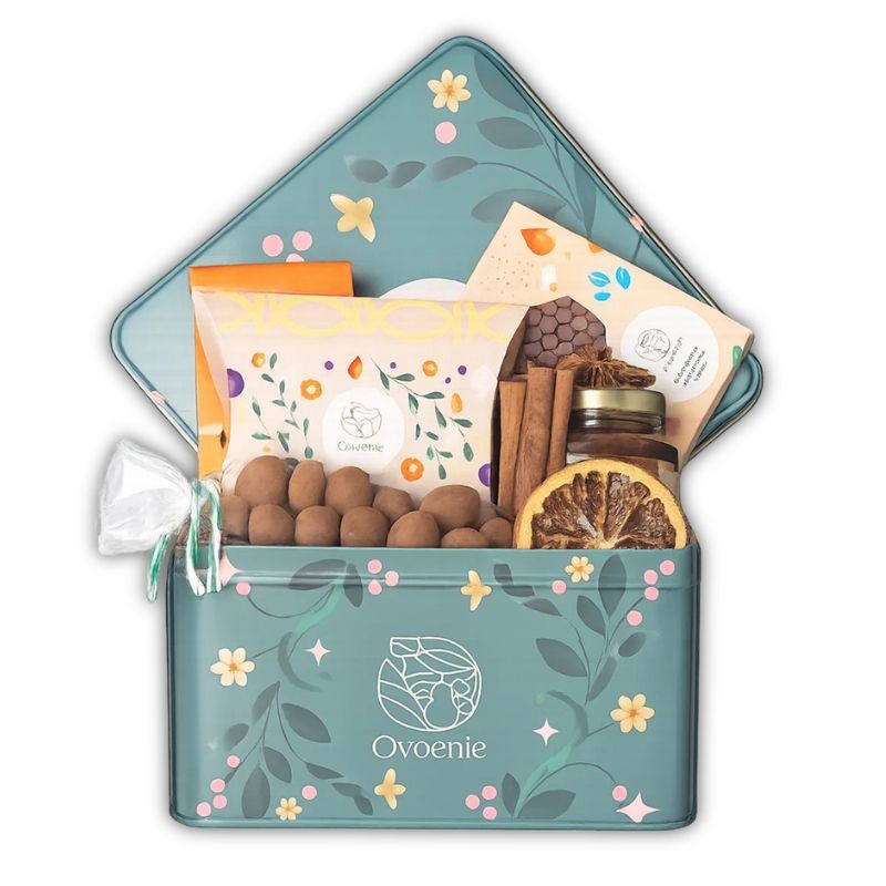 Metalowa puszka kryjąca asortyment naturalnych produktów Ovocnie: czekoladę mleczną z dodatkiem miodu, herbatę, ciasteczka w czekoladzie, migdały w mlecznej czekoladzie o zawartości 33% kakao z certyfikatem Cocoa Horizons, oprószone cynamonem, słoiczek konfitur z borówki ze skórką pomarańczową.