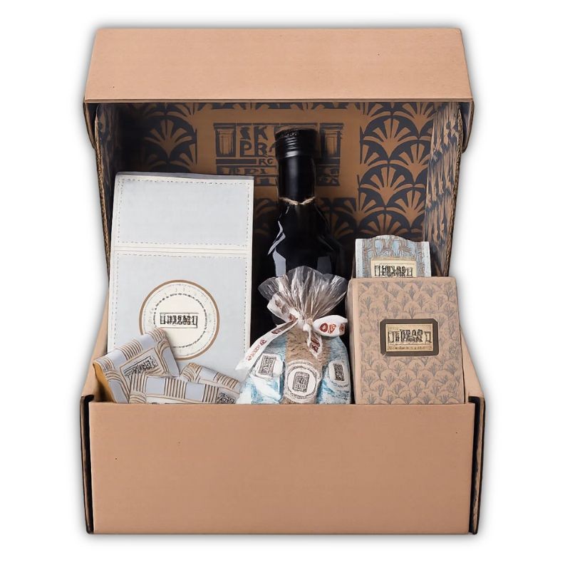 Kartonowe pudełko kryjące asortyment produktów Skład Praski: lukrowane pierniczki z nadzieniem owocowym, agrest w certyfikowanej, deserowej czekoladzie oprószony kakao, mini tabliczki z mlecznej czekolady z certyfikatem Cocoa Horizons, czarna herbata, pomarańczowy syrop do herbaty, ręcznie robione karmelki.